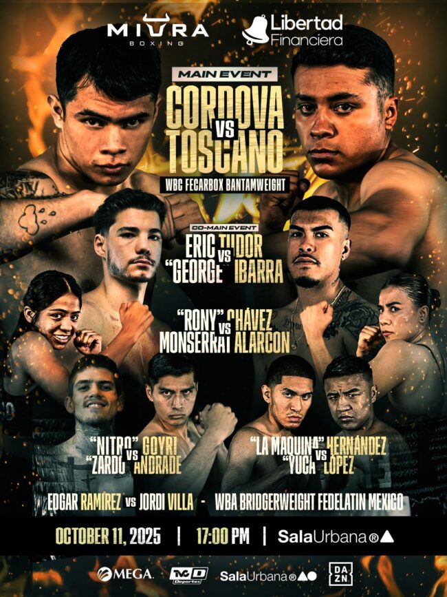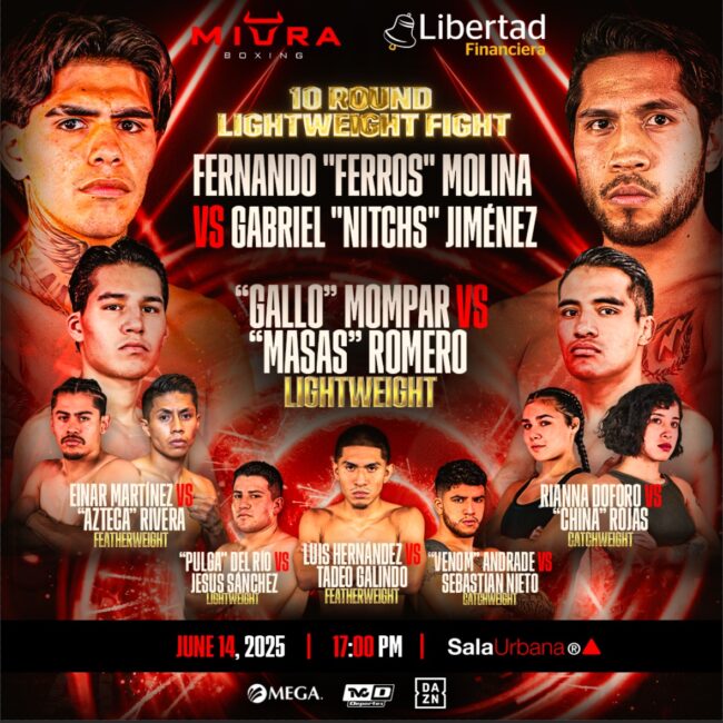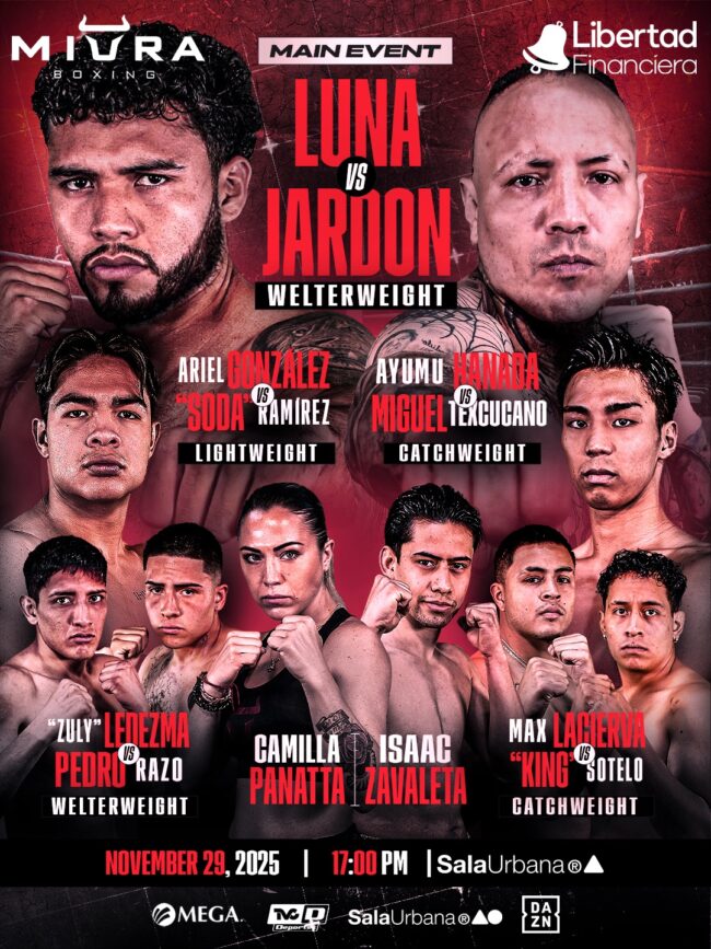 🥊 JULIO LUNA VS DANTÉ «CRAZY» JARDON Este 29 de noviembre, Miura Boxing presenta la última velada del 2025 con el mejor boxeo en Sala Urbana, Naucalpan. 🔥 Ariel «Chino» González vs Adrian «Soda» Ramírez 👊 Camilla Panatta vs Emily «Guerrera» Xochicale 👊 Vieris «Ninja» Ortega vs Joel «Trino» Cordoba 👊 Ayumu «Chingón» Hanada vs…